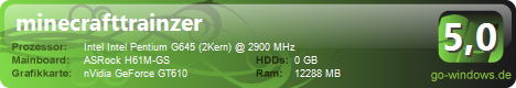 | Santi's PC (von Santi) | | CPU: | AMD Athlon(tm) 64 X2 Dual Core Processor 5600+ | | RAM: | nVidia GeForce GT610 | | Grafikkarte: | 4096 MB | | | · | #1 (von minecrafttrainzer) | | CPU: | Intel Intel Pentium G645 (2Kern) | | RAM: | nVidia GeForce GT610 | | Grafikkarte: | 12288 MB | | |