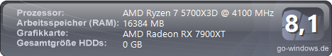 | AMD System (von BjörnW) | | CPU: | AMD Ryzen 7 5700X3D | | RAM: | AMD Radeon RX 7900XT | | Grafikkarte: | 16384 MB | | · | HH-PC (von PES_God) | | CPU: | AMD Ryzen 7 5700X3D 8-Core Processor | | RAM: | Radeon RX 7600 | | Grafikkarte: | 8192 MB | | · | Machinehead (von Machinehead) | | CPU: | AMD Ryzen 7 5700X3D 8-Core Processor | | RAM: | Sapphire Nitro+ Radeon RX 6800 XT | | Grafikkarte: | 65536 MB | | | · | Rechner (von Brachus) | | CPU: | Intel Intel(R) Core(TM) i7-14700KF | | RAM: | AMD Radeon RX 7900XTX | | Grafikkarte: | 65536 MB | | | · | AMD Rules (von FluffyBunny) | | CPU: | AMD Ryzen 5 5600X 6-Core Processor | | RAM: | AMD RX 6700 XT | | Grafikkarte: | 16384 MB | | | · | Meine Kiste (von mbesy) | | CPU: | AMD Ryzen 7 5700X 8-Core Processor | | RAM: | | | Grafikkarte: | 32768 MB | | | ·