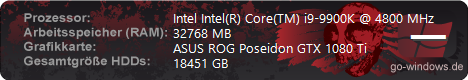 | Rainbow (von Hubertus) | | CPU: | Intel Intel(R) Core(TM) i9-9900K CPU @ 3.60GHz | | RAM: | | | Grafikkarte: | 32768 MB | | ··· | Gaming PC (von Lombax94) | | CPU: | Intel Intel(R) Core(TM) i9-9900K CPU @ 3.60GHz | | RAM: | | | Grafikkarte: | 32768 MB | | | · | GamingPC (von aXeVader) | | CPU: | Intel Intel(R) Core(TM) i9-9900KS CPU @ 4.00GHz | | RAM: | | | Grafikkarte: | 32768 MB | | | · | HI-Tech (von kawa500) | | CPU: | Intel Intel(R) Core(TM) i9-9900KF CPU @ 3.60GHz | | RAM: | | | Grafikkarte: | 32768 MB | | | · | PC One (von TheMeso) | | CPU: | Intel Intel(R) Core(TM) i9-9900K CPU @ 3.60GHz | | RAM: | | | Grafikkarte: | 16384 MB | | | · | Mein PC (von HollowGround) | | CPU: | Intel Intel(R) Core(TM) i9-9900K CPU @ 3.60GHz | | RAM: | | | Grafikkarte: | 16384 MB | | | · | Meta (von meta) | | CPU: | Intel Intel(R) Core(TM) i9-9900KF CPU @ 3.60GHz | | RAM: | | | Grafikkarte: | 16384 MB | | |