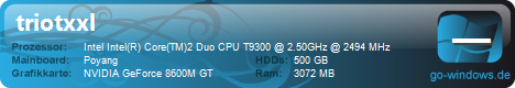 · | ACER Aspire (von Bulette) | | CPU: | Intel Mobile Core 2 Duo T7700 | | RAM: | NVIDIA GeForce 8600M GT | | Grafikkarte: | 2048 MB | | · | Acer Aspire 5920 (von cyarro) | | CPU: | Intel Intel(R) Core(TM)2 Duo CPU T9300 @ 2.50GHz | | RAM: | NVIDIA GeForce 8600M GT | | Grafikkarte: | 2048 MB | | | · | Acer (von myboo) | | CPU: | Intel Intel(R) Core(TM)2 Duo CPU T7700 @ 2.40GHz | | RAM: | NVIDIA GeForce 8600M GT | | Grafikkarte: | 4096 MB | | | ·· | Dell Inspiron 1720 (von cupra82) | | CPU: | Intel Intel(R) Core(TM)2 Duo CPU T9300 @ 2.50GHz | | RAM: | NVIDIA GeForce 8600M GT | | Grafikkarte: | 4096 MB | | | · | 7720G (von ZINO5) | | CPU: | Intel Intel(R) Core(TM)2 Duo CPU T7700 @ 2.40GHz | | RAM: | NVIDIA GeForce 8600M GT | | Grafikkarte: | 4096 MB | | | · | Mein Laptop (von Scarface79) | | CPU: | Intel Mobile Core 2 Duo T7700 | | RAM: | NVIDIA GeForce 8600M GT | | Grafikkarte: | 2048 MB | | | · | MicroCube (von tripex) | | CPU: | Intel Mobile C2Duo T5800 | | RAM: | NVIDIA GeForce 8600M GT | | Grafikkarte: | 4096 MB | | |