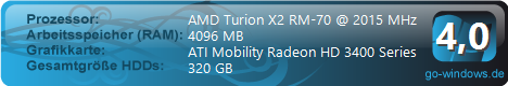 · | Packard bell (von dahuf86) | | CPU: | AMD Turion X2 RM-70 | | RAM: | ATI Mobility Radeon HD 3400 Series | | Grafikkarte: | 4096 MB | | | · | Lasse (von Icedive) | | CPU: | AMD Turion X2 RM-70 | | RAM: | ATI Mobility Radeon HD 3400 Series | | Grafikkarte: | 4096 MB | | |