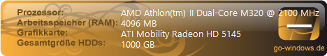 | Lord of Time (von Lord of Time) | | CPU: | AMD Athlon(tm) II Dual-Core M320 | | RAM: | ATI Mobility Radeon HD 4570 | | Grafikkarte: | 4096 MB | | · | Lenovo G555 15.6 (von sebi360) | | CPU: | AMD Athlon(tm) II Dual-Core M320 | | RAM: | ATI Mobility Radeon HD 4200 | | Grafikkarte: | 2048 MB | | · | Marcel (von Mars96) | | CPU: | AMD Athlon(tm) II Dual-Core M320 | | RAM: | ATI Mobility Radeon HD 4500/5100 Series | | Grafikkarte: | 4096 MB | | | ·· | Laptop (von Krümelchen) | | CPU: | AMD Athlon(tm) II Dual-Core M320 | | RAM: | ATI Mobility Radeon HD 4300 Series | | Grafikkarte: | 4096 MB | | | · | Laptop Arbeit (von TilmannB) | | CPU: | AMD Athlon(tm) II Dual-Core M320 | | RAM: | ATI Mobility Radeon HD 4500 Series | | Grafikkarte: | 2048 MB | | | ·· | ASUS PRO7 (von halogamer88) | | CPU: | Intel Intel(R) Core(TM) i5 CPU M 430 @ 2.27GHz | | RAM: | ATI Mobility Radeon HD 5145 | | Grafikkarte: | 4096 MB | | | · | OMSI LEppi (von Philip) | | CPU: | AMD Athlon(tm) II Dual-Core M320 | | RAM: | AMD M880G with ATI Mobility Radeon HD 4200 | | Grafikkarte: | 3072 MB | | | · | Asus X70AF (von Delicious) | | CPU: | AMD Athlon(tm) II Dual-Core M320 | | RAM: | ATI Mobility Radeon HD 5145 | | Grafikkarte: | 4096 MB | | | · | Asus X5EA Series (von RH2009) | | CPU: | AMD Athlon(tm) II Dual-Core M320 | | RAM: | ATI Mobility Radeon HD 4200 Series | | Grafikkarte: | 4096 MB | | | · | CyberRazzer (von CyberRazzer) | | CPU: | AMD Athlon(tm) II Dual-Core M320 | | RAM: | ATI Mobility Radeon HD 4200 | | Grafikkarte: | 2048 MB | | | · | MSI CR610 (von felix619) | | CPU: | AMD Athlon(tm) II Dual-Core M320 | | RAM: | ATI Mobility Radeon HD 4200 Series | | Grafikkarte: | 4096 MB | | | · | Asus X52 j (von 3L3C7R0) | | CPU: | Intel Intel(R) Core(TM) i3 CPU M 350 @ 2.27GHz | | RAM: | ATI Mobility Radeon HD 5145 | | Grafikkarte: | 4096 MB | | | · | Samsung (von TyczkaPL) | | CPU: | AMD Athlon(tm) II Dual-Core M320 | | RAM: | ATI Mobility Radeon HD 5470 | | Grafikkarte: | 3072 MB | | |