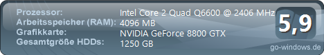 | Vudini (von Vudini) | | CPU: | Intel Core 2 Quad Q6600 | | RAM: | NVIDIA GeForce 8800 GTX | | Grafikkarte: | 2048 MB | | | · | wert (von gismotg) | | CPU: | Intel Core 2 Quad Q6600 | | RAM: | NVIDIA GeForce 8800 GTX | | Grafikkarte: | 4096 MB | | | · | Gamesstorm (von Gamesstorm) | | CPU: | Intel Core 2 Quad Q6600 | | RAM: | NVIDIA GeForce 8800 GTX | | Grafikkarte: | 8192 MB | | | · | Max Pc (von 0xmaxx0) | | CPU: | Intel Core 2 Quad Q6600 | | RAM: | NVIDIA GeForce 8800 GTX | | Grafikkarte: | 4096 MB | | | · | Helge´s PC (von Helge S.) | | CPU: | Intel Core 2 Quad Q6600 | | RAM: | NVIDIA GeForce 8800 GTX | | Grafikkarte: | 4096 MB | | | ·· | BuXXes PC (von BuXXe) | | CPU: | Intel Core 2 Quad Q6600 | | RAM: | NVIDIA GeForce 8800 GTX | | Grafikkarte: | 4096 MB | | | · | Meiner ! (von BIGboss) | | CPU: | Intel Core 2 Quad Q6600 | | RAM: | NVIDIA GeForce 8800 GTX | | Grafikkarte: | 4096 MB | | | · | BuXXes PC (von BuXXe) | | CPU: | Intel Core 2 Quad Q6600 | | RAM: | NVIDIA GeForce 8800 GTX | | Grafikkarte: | 4096 MB | | | · | RedAlba (von RedAlba) | | CPU: | Intel Core 2 Quad Q6600 | | RAM: | NVIDIA GeForce 8800 GTX | | Grafikkarte: | 3072 MB | | | · | PC (von TTL86) | | CPU: | Intel Core 2 Quad Q6600 | | RAM: | NVIDIA GeForce 8800 GTX | | Grafikkarte: | 4096 MB | | | ·· | xPC (von sakeN) | | CPU: | Intel Core 2 Quad Q6600 | | RAM: | NVIDIA GeForce 8800 GTX | | Grafikkarte: | 4096 MB | | | · | Mein Recher (von pazifist) | | CPU: | Intel Core 2 Quad Q6600 | | RAM: | NVIDIA GeForce 8800 GTX (Microsoft Corporation - WDDM v1.1) | | Grafikkarte: | 4096 MB | | | · | DELL (von mfmf) | | CPU: | Intel Core 2 Quad Q6600 | | RAM: | NVIDIA GeForce 8800 GTX | | Grafikkarte: | 8192 MB | | |