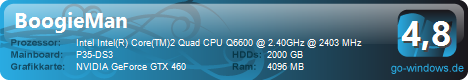 | Dani (von Gnomina) | | CPU: | Intel Intel(R) Core(TM)2 Quad CPU Q6600 @ 2.40GHz | | RAM: | NVIDIA GeForce 9800 GTX/9800 GTX+ | | Grafikkarte: | 4096 MB | | · | ZeRoOnE (von ZeRoOnE1980) | | CPU: | Intel Intel(R) Core(TM)2 Quad CPU Q6600 @ 2.40GHz | | RAM: | ATI Radeon HD 3850 | | Grafikkarte: | 4096 MB | | · | PC (von DerFreiburger) | | CPU: | Intel Intel(R) Core(TM)2 Quad CPU Q6600 @ 2.40GHz | | RAM: | NVIDIA GeForce GTX 460 | | Grafikkarte: | 4096 MB | | | · | PlaYOuT (von PlaYOuT) | | CPU: | Intel Intel(R) Core(TM)2 Quad CPU Q6600 @ 2.40GHz | | RAM: | nVidia GeForce GTX 460 | | Grafikkarte: | 3072 MB | | | · | haffhaff (von haffhaff) | | CPU: | Intel Intel(R) Core(TM)2 Quad CPU Q6600 @ 2.40GHz | | RAM: | NVIDIA GeForce 8800 GTX | | Grafikkarte: | 6144 MB | | | · | Koile (von koile) | | CPU: | Intel Intel(R) Core(TM)2 Quad CPU Q6600 @ 2.40GHz | | RAM: | AMD Radeon HD 6800 Series | | Grafikkarte: | 4096 MB | | | · | Th!nkP!nk (von fraudietrich88) | | CPU: | Intel Intel(R) Core(TM)2 Quad CPU Q6600 @ 2.40GHz | | RAM: | NVIDIA GeForce GTX 460 | | Grafikkarte: | 4096 MB | | | · | Tommy (von Khaos87) | | CPU: | Intel Intel(R) Core(TM)2 Quad CPU Q6600 @ 2.40GHz | | RAM: | Radeon HD 5850 | | Grafikkarte: | 6144 MB | | | · | DasDing (von DasDing) | | CPU: | Intel Intel(R) Core(TM)2 Quad CPU Q6600 @ 2.40GHz | | RAM: | NVIDIA GeForce GTX 460 + NITRO | | Grafikkarte: | 8192 MB | | | · | nosox - gaming (von nosox) | | CPU: | Intel Intel(R) Core(TM)2 Quad CPU Q6600 @ 2.40GHz | | RAM: | NVIDIA GeForce GTX 460 | | Grafikkarte: | 4096 MB | | | · | Meine Kiste (von Harderstylez) | | CPU: | Intel Intel(R) Core(TM)2 Quad CPU Q6600 @ 2.40GHz | | RAM: | NVIDIA GeForce GTX 460 | | Grafikkarte: | 4096 MB | | | · | Daddelkiste (von MrNobody) | | CPU: | Intel Intel(R) Core(TM)2 Quad CPU Q6600 @ 2.40GHz | | RAM: | NVIDIA GeForce GTX 470 | | Grafikkarte: | 5632 MB | | | · | AraneA (von aranea) | | CPU: | Intel Intel(R) Core(TM)2 Quad CPU Q6600 @ 2.40GHz | | RAM: | NVIDIA GeForce 9800 GT | | Grafikkarte: | 6144 MB | | | · | Mein PC (von Psyder) | | CPU: | Intel Intel(R) Core(TM)2 Quad CPU Q6600 @ 2.40GHz | | RAM: | NVIDIA GeForce GTX 460 | | Grafikkarte: | 3072 MB | | | · | bTc (von bTc) | | CPU: | Intel Intel(R) Core(TM)2 Quad CPU Q6600 @ 2.40GHz | | RAM: | OVERCLOCKED nVidia GeForce 8800 GTX | | Grafikkarte: | 4096 MB | | |