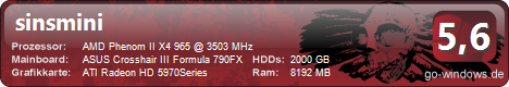 | Kick-Ass (von VirusX) | | CPU: | AMD Phenom II X4 965 Black Edition | | RAM: | Crossfire ATI Radeon HD 5850 OC @ 5870 | | Grafikkarte: | 8192 MB | | · | SilentShadow (von BM_90) | | CPU: | AMD Phenom II X4 965 Black Edition | | RAM: | Powercolor Radeon HD 5770 | | Grafikkarte: | 4096 MB | | · | Gaming PC (von Hakku) | | CPU: | AMD Phenom II X4 965 Black Edition | | RAM: | ATI Radeon HD 5800 Series | | Grafikkarte: | 8192 MB | | · | Damus' PC (von Damus) | | CPU: | AMD Phenom II X4 965 Black Edition | | RAM: | ATI Radeon HD 5770 Overclocked Edition | | Grafikkarte: | 4096 MB | | ···· | gamer (von nzogbiafan) | | CPU: | AMD Phenom II x4 965 | | RAM: | ATI Radeon HD5870 | | Grafikkarte: | 0 MB | | ··· | FuTuRe51 Gaming PC (von FuTuRe) | | CPU: | AMD Phenom II X4 965 Black Edition | | RAM: | ATI Radeon HD 4890 CrossFire | | Grafikkarte: | 4096 MB | | · | meiner (von foxi) | | CPU: | AMD Phenom II X4 965 Black Edition | | RAM: | XFX GTX260 Black Edition | | Grafikkarte: | 4096 MB | | · | AtzE StatioN (von ZocK-AtzE) | | CPU: | AMD Phenom II X4 965 Black Edition | | RAM: | ATI Radeon HD5870 | | Grafikkarte: | 0 MB | | · | Projekt 2010 (von Darla) | | CPU: | AMD Phenom II X4 965 | | RAM: | AMD Radeon HD 6970 | | Grafikkarte: | 8192 MB | | · | Gamer PC (von Dtex) | | CPU: | AMD Phenom II X4 965 Processor | | RAM: | GeForce GTX 460 Gainward GS 1GB | | Grafikkarte: | 4096 MB | |