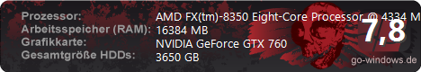 | Dark Side. (von Keiro) | | CPU: | AMD FX(tm)-8350 Eight-Core Processor | | RAM: | XFX HD7970 Dual Fan Black Edition | | Grafikkarte: | 12288 MB | | ·· | Manny (von Speedy581) | | CPU: | AMD FX(tm)-8350 Eight-Core Processor 8x 4,0/4,2 Ghz | | RAM: | GeForce GTX 580 | | Grafikkarte: | 12288 MB | | · | meiner (von wotan1990) | | CPU: | AMD FX(tm)-8350 Eight-Core Processor | | RAM: | Ati radeon 7950 | | Grafikkarte: | 8192 MB | | ·· | Lunasan (von KrustyOwned) | | CPU: | AMD AMD FX(tm)-8350 Eight-Core Processor Black Edition | | RAM: | AMD Radeon R9 280X | | Grafikkarte: | 16384 MB | | · | Runner (von SpikeCracker) | | CPU: | AuthenticAMD FX(tm)-8350 Eight-Core Processor | | RAM: | nVidia GTX 650 TI | | Grafikkarte: | 8192 MB | | · | AMD X8 (von PietroQ2) | | CPU: | AMD FX(tm)-8350 Eight-Core Processor | | RAM: | Geforce GTX 1050 TI | | Grafikkarte: | 16384 MB | | ·· | Mein PC (von djdomi1100) | | CPU: | AMD FX(tm)-8350 Eight-Core Processor | | RAM: | Gainward Gtx 680 Phantom | | Grafikkarte: | 8192 MB | | · | Marcel (von CeeKayOne) | | CPU: | AMD FX(tm)-8350 Eight-Core Processor | | RAM: | | | Grafikkarte: | 16384 MB | | ··· | Sikas 8 Kern (von sika4ever) | | CPU: | AMD FX(tm)-8350 Eight-Core Processor | | RAM: | GTX 970 Phantom | | Grafikkarte: | 16384 MB | | ·