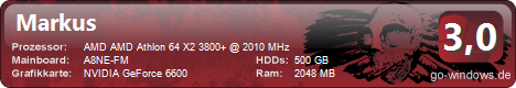| Sebi (von DJSebiMaster) | | CPU: | AMD Athlon 64 3700+ | | RAM: | NVIDIA GeForce 8600 GT | | Grafikkarte: | 1024 MB | | | · | Deutschland PC (von Markus) | | CPU: | AMD AMD Athlon 64 X2 3800+ | | RAM: | NVIDIA GeForce 6600 | | Grafikkarte: | 2048 MB | | | ·· | BenQ (von Eclipse) | | CPU: | AMD Athlon(tm) 64 X2 Dual Core Processor 6000+ | | RAM: | NVIDIA GeForce 6600 | | Grafikkarte: | 3072 MB | | | · | nobskiller (von 4everuser) | | CPU: | AMD Athlon(tm) 64 Processor 3400+ | | RAM: | NVIDIA GeForce 8600 GT | | Grafikkarte: | 1536 MB | | | · | SIDy-PC (von sidy) | | CPU: | AMD Athlon(tm) 64 X2 Dual Core Processor 4000+ | | RAM: | NVIDIA GeForce 6600 | | Grafikkarte: | 4096 MB | | | ··· | N!cks PC (von N1ck) | | CPU: | Intel Intel(R) Pentium(R) 4 CPU 2.40GHz | | RAM: | NVIDIA GeForce 6600 GT | | Grafikkarte: | 2048 MB | | | · | maxaz (von maxaz) | | CPU: | Intel Intel(R) Pentium(R) 4 CPU 2.66GHz | | RAM: | NVIDIA GeForce 6600 | | Grafikkarte: | 1536 MB | | | · | Bone2212 (von Bone2212) | | CPU: | AMD Athlon(tm) 64 X2 3800+ @ 4200+ | | RAM: | NVIDIA GeForce 9600 GT OC Zilent 1G | | Grafikkarte: | 3072 MB | | | · | PC (von Ichigo) | | CPU: | AMD Athlon(tm) 64 X2 Dual Core Processor 3800+ | | RAM: | NVIDIA GeForce GT 220 | | Grafikkarte: | 1024 MB | | | · | meiner (von shadowmaker) | | CPU: | AMD Athlon(tm) 64 X2 Dual Core Processor 4000+ | | RAM: | NVIDIA GeForce 6600 GT | | Grafikkarte: | 2048 MB | | | · | Marvin (von skaii) | | CPU: | AMD Athlon(tm) 64 Processor 3200+ | | RAM: | NVIDIA GeForce 6600 GT | | Grafikkarte: | 1024 MB | | | · | PC (von Vyra) | | CPU: | AMD Athlon(tm) 64 Processor 4000+ | | RAM: | NVIDIA GeForce 7600 GT | | Grafikkarte: | 1024 MB | | |