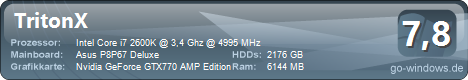· | Einer fuer alles (von TritonX) | | CPU: | Intel Core i7 2600K @ 3,4 Ghz | | RAM: | Nvidia GeForce GTX770 AMP Edition | | Grafikkarte: | 0 MB | | ·· | Mein PC (von Mäxx93) | | CPU: | Intel Core i7 2600K | | RAM: | NVIDIA GeForce GTX 590 | | Grafikkarte: | 8192 MB | | · | HarvestGreat (von HarvestGreat) | | CPU: | Intel Intel(R) Core(TM) i7-2600K CPU @ 4.50GHz | | RAM: | Nvidia MSI Twin Frozer III GTX 570 | | Grafikkarte: | 8192 MB | | · | Targon (von Avadon) | | CPU: | Intel Core i7-2600K | | RAM: | nVidia GeForce ENGTX480 | | Grafikkarte: | 8192 MB | | · | Andy´s PC (von Andy2780) | | CPU: | Intel i7-2600K | | RAM: | ATI Radeon HD 5870 | | Grafikkarte: | 4096 MB | | ·· | Simply Red (von techie) | | CPU: | Intel Intel(R) Core(TM) i7-2600K CPU @ 3.40GHz | | RAM: | AMD Radeon HD 6900 Series | | Grafikkarte: | 16384 MB | | | · | CMOS (von CMOS) | | CPU: | Intel Intel(R) Core(TM) i7-2600K CPU | | RAM: | EVGA GTX 460 SSC | | Grafikkarte: | 16384 MB | | | · | MyPC (von ChriRosi) | | CPU: | Intel Intel(R) Core(TM) i7-2600K CPU @ 3.40GHz | | RAM: | AMD Radeon HD 6990 | | Grafikkarte: | 8192 MB | | | · | My PC (von Mare28) | | CPU: | Intel Intel(R) Core(TM) i7-2600K CPU @ 3.40GHz | | RAM: | nVidia GTS 250 | | Grafikkarte: | 16384 MB | | |