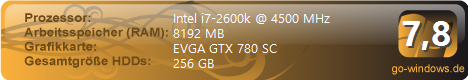 | Spielekiste (von Oakraven) | | CPU: | Intel Core i7-2600K @4300Mhz | | RAM: | nVidia GeForce 8800 GTX | | Grafikkarte: | 8192 MB | | · | Game PC (von MoUsZ) | | CPU: | Intel Intel(R) Core(TM) i7-2600K CPU @ 3.40GHz | | RAM: | nVidia GeForce GTX590 | | Grafikkarte: | 16384 MB | | · | Gaming (von Finessê) | | CPU: | Intel Intel(R) Core(TM) i7-2600K CPU @ 3.40GHz | | RAM: | NVIDIA GeForce GTX 570 | | Grafikkarte: | 8192 MB | | | · | The Beast (von Overly21) | | CPU: | Intel Intel(R) Core(TM) i7-2600K CPU @ 3.40GHz | | RAM: | NVIDIA GeForce GTX 580 | | Grafikkarte: | 8192 MB | | | · | Desktop-Rechner (von hallo2) | | CPU: | Intel Intel(R) Core(TM) i7-2600K CPU @ 3.40GHz | | RAM: | ATI Radeon 6950 | | Grafikkarte: | 16384 MB | | | · | i7 Power (von bleili) | | CPU: | Intel Core i7-2600K CPU @ 3.40GHz | | RAM: | Nvidia GTX 580 | | Grafikkarte: | 1228800 MB | | |