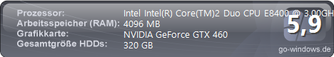 | Liebling v.1.1 (von Adriano) | | CPU: | Intel Intel(R) Core(TM)2 Duo CPU E8400 @ 3.00GHz | | RAM: | NVIDIA GeForce GTX 460 | | Grafikkarte: | 4096 MB | | · | Liebling (von Adriano) | | CPU: | Intel Intel(R) Core(TM)2 Duo CPU E8400 @ 3.00GHz | | RAM: | NVIDIA GeForce GTX 460 | | Grafikkarte: | 4096 MB | | · | Cyberhawk (von Cyberhawk) | | CPU: | Intel Intel(R) Core(TM)2 Duo CPU E8400 @ 3.00GHz | | RAM: | nVidia GeForce GTX 460 | | Grafikkarte: | 4096 MB | | | · | AcE II (von -wolle-) | | CPU: | Intel Intel(R) Core(TM)2 Duo CPU E8400 @ 3.00GHz | | RAM: | NVIDIA GeForce GTX 460 | | Grafikkarte: | 8192 MB | | | · | Uno (von Jone) | | CPU: | Intel Intel(R) Core(TM)2 Duo CPU E8400 @ 3.00GHz | | RAM: | NVIDIA GeForce GTX 460 | | Grafikkarte: | 4096 MB | | | · | Zockermali (von Zockermali) | | CPU: | Intel Intel(R) Core(TM)2 Duo CPU E8400 @ 3.00GHz | | RAM: | NVIDIA GeForce GTX 460 | | Grafikkarte: | 5120 MB | | | · | PC (von eXpO) | | CPU: | Intel Intel(R) Core(TM)2 Duo CPU E8400 @ 3.00GHz | | RAM: | NVIDIA GeForce GTX 460 | | Grafikkarte: | 4096 MB | | |