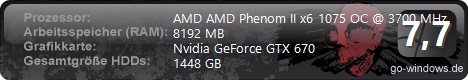 | Mein PC 2012 (von renesweb) | | CPU: | Intel Intel(R) Core(TM) i7-3770K CPU @ 3.50GHz | | RAM: | nVidia GeForce GTX 670 Windforce X3 | | Grafikkarte: | 16384 MB | | · | Alex´s Gaming-PC (von AlexGee94) | | CPU: | Intel Intel(R) Core(TM) i7-2600 CPU @ 3.40GHz | | RAM: | nVidia GeForce GTX 670 OC | | Grafikkarte: | 8192 MB | | · | NZXT (von Skywalker) | | CPU: | AMD FX(tm)-8320 Eight-Core Processor | | RAM: | GTX 550 Ti OC Cyclone II | | Grafikkarte: | 8192 MB | | · | Amd fx (von biker5476) | | CPU: | AMD FX(tm)-8150 Eight-Core Processor | | RAM: | AMD Radeon HD 6900 Series | | Grafikkarte: | 8192 MB | | · | Quad (von Lilinee) | | CPU: | Intel Core i7-2600K | | RAM: | NVIDIA GeForce GTX 670 PE/OC | | Grafikkarte: | 4096 MB | | ·· | MSI GT 70 (von Kingdom3633) | | CPU: | Intel Intel(R) Core(TM) i7-3610QM CPU @ 2.30GHz | | RAM: | NVIDIA Geforce GTX 670M | | Grafikkarte: | 8192 MB | | · | NZXT (von Chrisi132) | | CPU: | Intel i5-3570K | | RAM: | nVidia GeForce GTX 670 | | Grafikkarte: | 8192 MB | | ·· | V.O.X (von sternentor-1) | | CPU: | AMD FX 8120 8 Kern Prozessor | | RAM: | Nvidia GeForce GTX 670 | | Grafikkarte: | 16384 MB | | ·· | mein pc (von patyvovin) | | CPU: | AMD Phenom(tm) II X6 1090T Processor | | RAM: | nVidia Geforce GTX 670 | | Grafikkarte: | 8192 MB | | · | MONSTRUM (von Denix) | | CPU: | AMD FX(tm)-8350 Eight-Core Processor | | RAM: | nVidia GeForce GTX 670 Phantom | | Grafikkarte: | 16384 MB | | · | Phantom GTX670 (von Kauve) | | CPU: | Intel Intel Core i5-2500K CPU | | RAM: | NVIDIA GeForce GTX 670 | | Grafikkarte: | 8192 MB | | ·