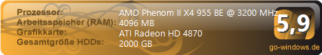 | Gaming-PC (von the_f4b1) | | CPU: | AMD Phenom(tm) II X4 965 Processor | | RAM: | Radeon HD 5850 | | Grafikkarte: | 4096 MB | | · | Swift PC (von swiftgoon) | | CPU: | AMD Phenom II X4 955 BE | | RAM: | Radeon HD 4890 Vapor-X | | Grafikkarte: | 8192 MB | | ·· | Black Box (von Sevenburner) | | CPU: | AMD Phenom(tm) II X4 20 Processor | | RAM: | NVIDIA GeForce GTX 285 | | Grafikkarte: | 8192 MB | | ··· | Phenomenom (von phillie777) | | CPU: | AMD Phenom II X4 940 Black Edition | | RAM: | 2x ATI Radeon HD 4870 Series | | Grafikkarte: | 8192 MB | | · | Mein PC (von euunit) | | CPU: | AMD Phenom II X4 955 BE | | RAM: | ATI Radeon HD 4870 | | Grafikkarte: | 4096 MB | | · | Gaming (von Sky-Net) | | CPU: | AMD Phenom(tm) II X6 1100T Processor | | RAM: | ATI Radeon HD 4870 X2 | | Grafikkarte: | 16384 MB | | · | collapse (von consty) | | CPU: | AMD Phenom II X4 940 Black Edition | | RAM: | ATI Radeon HD 4870 | | Grafikkarte: | 6144 MB | | · | Billig PC (von MadMax40) | | CPU: | Intel Intel(R) Core(TM)2 Quad CPU Q6700 @ 2.66GHz | | RAM: | ATI Radeon HD 4870 TOXIC | | Grafikkarte: | 4096 MB | | ·· | I7 860 (von HFO2005) | | CPU: | Intel Core i7 | | RAM: | ATI Radeon HD 4870 Series | | Grafikkarte: | 8192 MB | | · | mkaz92 (von mkaz92) | | CPU: | AMD Phenom II X3 710 | | RAM: | NVIDIA GeForce GTX 260 | | Grafikkarte: | 4096 MB | | · | Zalman Z9+ (von Berkelfuerst) | | CPU: | AMD Phenom II X4 955 BE | | RAM: | AMD Radeon HD 6850 Cool Stream | | Grafikkarte: | 16384 MB | |