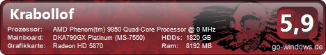 · | Donnie's Gaming PC (von Donnie) | | CPU: | AMD Phenom(tm) II X4 955 Processor OC @ 3,85 GHz | | RAM: | Radeon HD 5870 Crossfire | | Grafikkarte: | 8192 MB | | · | AMD X6 1095T (von Bushi) | | CPU: | AMD Phenom(tm) II X6 1090T Processor | | RAM: | Radeon HD 5870 | | Grafikkarte: | 8192 MB | | · | Asus G73 JH (von XphilY) | | CPU: | Intel Core i7 720QM | | RAM: | ATI Mobility Radeon HD 5870 | | Grafikkarte: | 4096 MB | | · | G73JH Stealth (von G73JH Stealth) | | CPU: | Intel Intel(R) Core(TM) i7 CPU Q 720 @ 1.60GHz | | RAM: | ATI Mobility Radeon HD 5870 | | Grafikkarte: | 8192 MB | | ··· | AMD + CM (von Dannyboy) | | CPU: | AMD Phenom(tm) II X4 965 Processor | | RAM: | ATI Radeon HD 5870 Vapor X | | Grafikkarte: | 819200 MB | | · | Mein Gamer pc (von Mueffelmauke) | | CPU: | AMD Phenom(tm) II X6 1090T Processor | | RAM: | Radeon HD 5870 Eyefinity 6 Edition | | Grafikkarte: | 8192 MB | | ·· | Milzbrand (von Cyb3rw0rm) | | CPU: | Intel Intel(R) Core(TM) i7 CPU 930 @ 2.80GHz | | RAM: | Radeon HD 5870 | | Grafikkarte: | 6144 MB | | · | AMD Gamer (von Jerry227) | | CPU: | AMD Phenom(tm) II X6 1090T Processor | | RAM: | Radeon HD 5870 | | Grafikkarte: | 8192 MB | | · | b4ck`s ROBOTx rev.2 (von b4ck) | | CPU: | Intel Intel(R) Core(TM)2 Quad CPU Q9550 @ 2.83GHz | | RAM: | Sapphire Varpor-X Radeon HD 5870 | | Grafikkarte: | 6144 MB | | ·· | PC (von puma30) | | CPU: | AMD Phenom(tm) 9850 Quad-Core Processor | | RAM: | NVIDIA GeForce GTX 260 | | Grafikkarte: | 4096 MB | |