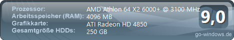 | Me (von Fobin) | | CPU: | AMD Athlon 64 X2 6000+ | | RAM: | NVIDIA GeForce 9500 GT | | Grafikkarte: | 4096 MB | | · | Power (von DarkEarth) | | CPU: | AMD Athlon 64 X2 6000+ | | RAM: | NVIDIA GeForce GTS 250 | | Grafikkarte: | 4096 MB | | | · | Kanah (von Kanah) | | CPU: | AMD Athlon 64 X2 6000+ | | RAM: | ATI Radeon HD 4850 | | Grafikkarte: | 2048 MB | | | · | Onearmy2 (von onearmy2) | | CPU: | AMD Athlon 64 X2 6000+ | | RAM: | NVIDIA GeForce GTX 260 | | Grafikkarte: | 4096 MB | | | · | Meins (von PitBull007) | | CPU: | AMD Athlon 64 X2 6000+ | | RAM: | NVIDIA GeForce 9500 GT | | Grafikkarte: | 4096 MB | | | · | meine Hulle (von hoschi) | | CPU: | AMD Athlon 64 X2 6000+ | | RAM: | ATI Radeon HD 4600 Series | | Grafikkarte: | 4096 MB | | |