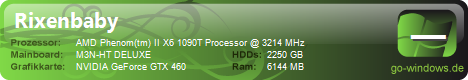 | Sekirei (von Jacko) | | CPU: | AMD Phenom(tm) II X6 1090T Processor | | RAM: | NVIDIA GeForce GTX 460 | | Grafikkarte: | 8192 MB | | ·· | HIGH-END (von RJan) | | CPU: | AMD Phenom(tm) II X6 1090T Processor | | RAM: | NVidia Geforce GTX 460 | | Grafikkarte: | 8192 MB | | · | my pc (von Gangsta147147) | | CPU: | AMD Phenom(tm) II X6 1090T Processor | | RAM: | NVIDIA GeForce GTX 460 | | Grafikkarte: | 819200 MB | | | · | Gaming (von MikrobePferd) | | CPU: | AMD Phenom(tm) II X6 1090T Processor | | RAM: | NVIDIA GeForce GTX 460 | | Grafikkarte: | 8192 MB | | | · | Hakker3 (von Hakker) | | CPU: | AMD Phenom(tm) II X6 1090T Processor | | RAM: | NVIDIA GeForce GTX 460 | | Grafikkarte: | 4096 MB | | | · | Gamer PC (von rovelke80) | | CPU: | AMD Phenom(tm) II X6 1090T Processor | | RAM: | NVIDIA GeForce GTX 460 | | Grafikkarte: | 8192 MB | | | · | HD (von RoleS) | | CPU: | AMD Phenom(tm) II X6 1090T Processor | | RAM: | NVIDIA GeForce GTX 460 | | Grafikkarte: | 8192 MB | | | · | MeinZockerPc (von Patrickle) | | CPU: | AMD Phenom(tm) II X6 1090T Processor | | RAM: | NVIDIA GeForce GTX 460 | | Grafikkarte: | 8192 MB | | | · | Workstation (von DopeEx) | | CPU: | AMD Phenom(tm) II X6 1090T Processor | | RAM: | NVIDIA GeForce GTX 460 | | Grafikkarte: | 4096 MB | | | · | mein pc (von neco) | | CPU: | AMD Phenom(tm) II X6 1090T Processor | | RAM: | NVIDIA GeForce GTX 460 SE | | Grafikkarte: | 4096 MB | | | · | Desktop_Gaming (von Cr@zyMike) | | CPU: | AMD Phenom(tm) II X6 1090T Processor | | RAM: | NVIDIA GeForce GTX 460 | | Grafikkarte: | 4096 MB | | |