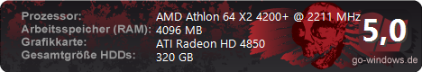 · | Magnus-PC (von magnus16) | | CPU: | Intel Intel(R) Core(TM)2 Quad CPU Q8400 @ 2.66GHz | | RAM: | ATI Radeon HD 4850 | | Grafikkarte: | 3072 MB | | · | Lanbox (von Blacky2402) | | CPU: | AMD Phenom(tm) II X3 720 Processor | | RAM: | ATI Radeon HD 4850 | | Grafikkarte: | 3072 MB | | ·· | iMac 27 i7 (von Pirated) | | CPU: | Intel Intel(R) Core(TM) i7 CPU 860 @ 2.80GHz | | RAM: | ATI Radeon HD 4850 | | Grafikkarte: | 16384 MB | | · | Red Tank (von XeoViruX) | | CPU: | AMD Athlon 64 X2 6000+ | | RAM: | ATI Radeon HD 4850 | | Grafikkarte: | 4096 MB | | ·· | mei hittn (von L0rd) | | CPU: | AMD Phenom(tm) II X4 955 Processor | | RAM: | ATI Radeon HD 4850 Series | | Grafikkarte: | 8192 MB | | · | RoyaL (von BloodRoyaLe) | | CPU: | AMD Athlon 64 X2 4200+ | | RAM: | ATI Radeon HD 4850 | | Grafikkarte: | 4096 MB | | · | Acer (von magnum55) | | CPU: | AMD Phenom | | RAM: | ATI Radeon HD 4850 x2 | | Grafikkarte: | 0 MB | | | · | Test-PC (von Windoof7) | | CPU: | AMD Athlon 64 X2 4200+ | | RAM: | nVidia GeForce 210 | | Grafikkarte: | 4096 MB | | | · | KingKenny (von KingKenny9977) | | CPU: | AMD Phenom(tm) II X4 965 Processor | | RAM: | ATI Radeon HD 4850 X2 | | Grafikkarte: | 12288 MB | | | ·· | alter gamer PC (von kRn) | | CPU: | AMD Athlon(tm) 64 X2 Dual Core Processor 6000+ | | RAM: | Radeon HD 5870 | | Grafikkarte: | 2048 MB | | | · | newerasamd (von newera46) | | CPU: | AMD Athlon(tm) 64 X2 Dual Core Processor 6400+ | | RAM: | NVIDIA GeForce GTX 260 | | Grafikkarte: | 2048 MB | | |