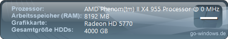 | Home (von Lazerboy) | | CPU: | AMD Phenom(tm) II X4 955 Processor | | RAM: | Radeon HD 5770 | | Grafikkarte: | 4096 MB | | · | Legend (von legend1907) | | CPU: | AMD Phenom(tm) II X4 955 Processor | | RAM: | Radeon HD 5770 | | Grafikkarte: | 4096 MB | | · | Kubba-PC (von Kubba96) | | CPU: | AMD Phenom(tm) II X4 955 Processor | | RAM: | Radeon HD 5770 | | Grafikkarte: | 4096 MB | | · | Mein PC (von KennethZMusic) | | CPU: | AMD Phenom(tm) II X4 955 Processor | | RAM: | Radeon HD 5770 / Demnächst GTX 570 Phantom | | Grafikkarte: | 4096 MB | | ·· | MeinPC (von ABDeluxe) | | CPU: | AMD Phenom(tm) II X4 955 Processor | | RAM: | 2x Radeon HD 5770 (Crossfire) | | Grafikkarte: | 6144 MB | | · | Roaches (von megaraver) | | CPU: | AMD Phenom(tm) II X4 955 Processor | | RAM: | Radeon HD 5770 | | Grafikkarte: | 4096 MB | | | · | Mein PC (von stonecold) | | CPU: | AMD Phenom(tm) II X4 955 Processor | | RAM: | Radeon HD 5770 | | Grafikkarte: | 4096 MB | | | · | Xigmatek R (von Dennis-R) | | CPU: | AMD Phenom(tm) II X4 955 Processor | | RAM: | Radeon HD 5770 Overclocked | | Grafikkarte: | 6144 MB | | | · | Mein PC (von Dennis.R) | | CPU: | AMD Phenom(tm) II X4 955 Processor | | RAM: | Radeon HD 5770 | | Grafikkarte: | 6144 MB | | | · | Windows (von exctase) | | CPU: | AMD Phenom(tm) II X4 955 Processor | | RAM: | Radeon HD 5770 | | Grafikkarte: | 4096 MB | | | ·· | Core (von BRCore) | | CPU: | AMD Phenom(tm) II X4 955 Processor | | RAM: | Radeon HD 5770 | | Grafikkarte: | 4096 MB | | | · | tete (von Rukaj) | | CPU: | AMD Phenom(tm) II X4 955 Processor | | RAM: | Radeon HD 5770 | | Grafikkarte: | 4096 MB | | | · | Xlay3r (von Xlay3r) | | CPU: | AMD Phenom(tm) II X4 955 Processor | | RAM: | Radeon HD 5770 | | Grafikkarte: | 4096 MB | | |
