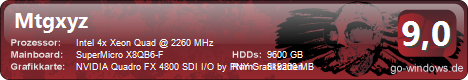 | Teurer PC (von Mtgxyz) | | CPU: | Intel 4x Xeon Quad | | RAM: | NVIDIA Quadro FX 4800 SDI I/O by PNY Grafikkarten | | Grafikkarte: | 425984 MB | | |