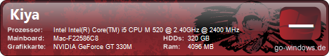 | Muckel (von PsychoMuckel) | | CPU: | Intel Intel(R) Core(TM) i5 CPU M 520 @ 2.40GHz | | RAM: | NVIDIA GeForce GT 330M | | Grafikkarte: | 4096 MB | | · | MacBook Pro 15" (von SirClaude) | | CPU: | Intel Intel(R) Core(TM) i5 CPU M 540 @ 2.53GHz | | RAM: | NVIDIA GeForce GT 330M | | Grafikkarte: | 4096 MB | | | · | MacBookPro 15' (von dagci53) | | CPU: | Intel Intel(R) Core(TM) i5 CPU M 520 @ 2.40GHz | | RAM: | NVIDIA GeForce GT 330M | | Grafikkarte: | 4096 MB | | | · | Olo21 (von Olo21) | | CPU: | Intel Intel(R) Core(TM) i5 CPU M 520 @ 2.40GHz | | RAM: | NVIDIA GeForce GT 330M | | Grafikkarte: | 8192 MB | | | · | dell vostro 3700 (von c4un7er12) | | CPU: | Intel Intel(R) Core(TM) i5 CPU M 520 @ 2.40GHz | | RAM: | NVIDIA GeForce GT 330M | | Grafikkarte: | 4096 MB | | |