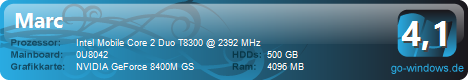 | Laptop (von FuTuRe) | | CPU: | AMD Turion 64 X2 Mobile TL-58 | | RAM: | NVIDIA GeForce 8400M GS | | Grafikkarte: | 2048 MB | | ·· | fabi (von fabi1234) | | CPU: | Intel Intel(R) Core(TM)2 Duo CPU T5450 @ 1.66GHz | | RAM: | NVIDIA GeForce 8400M GS | | Grafikkarte: | 2048 MB | | | ··· | xRahz (von xRahz) | | CPU: | Intel Intel(R) Core(TM)2 Duo CPU T9300 @ 2.50GHz | | RAM: | NVIDIA GeForce 8400M GS | | Grafikkarte: | 4096 MB | | | ··· | DriftLaptop (von DriftKing96) | | CPU: | AMD Turion(tm) 64 X2 Mobile Technology TL-60 | | RAM: | NVIDIA GeForce 8400M GS | | Grafikkarte: | 3072 MB | | | ·· | Medion (von Hanebane) | | CPU: | Intel Intel(R) Core(TM)2 Duo CPU T5450 @ 1.66GHz | | RAM: | NVIDIA GeForce 8400M GS | | Grafikkarte: | 2048 MB | | | · | Lappy (von abcmann) | | CPU: | AMD Turion(tm) 64 X2 Mobile Technology TL-56 | | RAM: | NVIDIA GeForce 8400M GS | | Grafikkarte: | 2048 MB | | | ·· | XPS M1530 (von X4tred) | | CPU: | Intel Mobile Core 2 Duo T8300 | | RAM: | NVIDIA GeForce 8600M GT | | Grafikkarte: | 2048 MB | | | · | 1 (von Willkuer) | | CPU: | Intel Mobile Core 2 Duo T8300 | | RAM: | NVIDIA GeForce 8600M GS | | Grafikkarte: | 4096 MB | | |