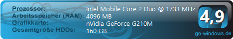 · | Asus G1S (von Dresik) | | CPU: | Intel Mobile Core 2 Duo T7700 | | RAM: | | | Grafikkarte: | 12288 MB | | · | Gateway P-7811FX (von falu) | | CPU: | Intel Mobile Core 2 Duo P8400 | | RAM: | NVIDIA GeForce 9800M GTS | | Grafikkarte: | 4096 MB | | · | MacBook Pro (von blackra1n) | | CPU: | Intel Mobile Core 2 Duo P8600 | | RAM: | NVIDIA GeForce 320M | | Grafikkarte: | 4096 MB | | · | Toshiba (von paeppi) | | CPU: | Intel2 Mobile Core 2 Duo T7500 | | RAM: | NVIDIA GeForce 8700M GT | | Grafikkarte: | 4096 MB | | · | ASUS X90S (von GPunkt) | | CPU: | Intel Mobile Core 2 Duo T6400 | | RAM: | NVIDIA GeForce GT 130M | | Grafikkarte: | 4096 MB | | ··· | mzq (von mzq) | | CPU: | Intel Mobile Core 2 Duo P9500 | | RAM: | ATI Mobility Radeon HD 4850 | | Grafikkarte: | 4096 MB | | · | My Pc (von clodx) | | CPU: | Intel Mobile Core 2 Duo T6400 | | RAM: | ATI Mobility Radeon HD 4500 Series | | Grafikkarte: | 4096 MB | | · | HP Compaq nx9420 (von XphilY) | | CPU: | Intel Mobile Core 2 Duo T5600 | | RAM: | ATI Mobility Radeon X1600 | | Grafikkarte: | 3072 MB | | · | LG P310 (von h3mPi) | | CPU: | Intel Mobile Core 2 Duo P9500 | | RAM: | NVIDIA GeForce 9600M GT | | Grafikkarte: | 4096 MB | | ··· | ASUS X5AV (von kony) | | CPU: | Intel Mobile Core 2 Duo T5850 | | RAM: | NVIDIA GeForce 9650M GT | | Grafikkarte: | 4096 MB | |