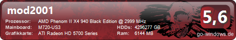 | LAN-PC (von xTimequesTx) | | CPU: | AMD K10 | | RAM: | ATI Radeon HD 5700 Series | | Grafikkarte: | 4096 MB | | | · | MainPC (von Devilworld) | | CPU: | AMD Phenom II X4 940 Black Edition | | RAM: | ATI Radeon HD 5700 Series | | Grafikkarte: | 4096 MB | | | · | . (von Blatchi) | | CPU: | AMD Phenom II X4 965 Black Edition | | RAM: | ATI Radeon HD 5700 Series | | Grafikkarte: | 2048 MB | | | · | MeinPC (von coolruffy) | | CPU: | AMD Phenom II X4 940 Black Edition | | RAM: | ATI Radeon HD 4600 Series | | Grafikkarte: | 4096 MB | | | · | Gonzales (von Shoroop) | | CPU: | AMD Phenom II X4 940 Black Edition | | RAM: | ATI Radeon HD 5700 Series | | Grafikkarte: | 8192 MB | | | · | Frettchen7 (von Frettchen7) | | CPU: | AMD Phenom II X4 940 Black Edition | | RAM: | ATI Radeon HD 4800 Series | | Grafikkarte: | 4096 MB | | |