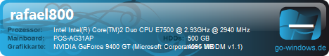 © 2025 mein-pc.eu - rafael: POS-AG31AP - Intel Intel(R) Core(TM)2 Duo CPU E7500 @ 2.93GHz - NVIDIA GeForce 9400 GT (Microsoft Corporation - WDDM v1.1) - powered by go-windows.de